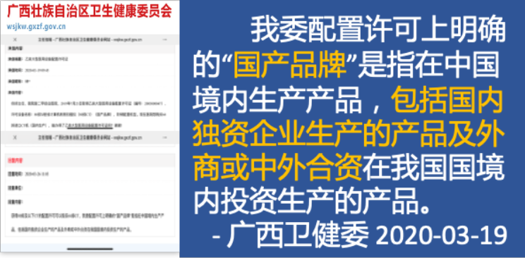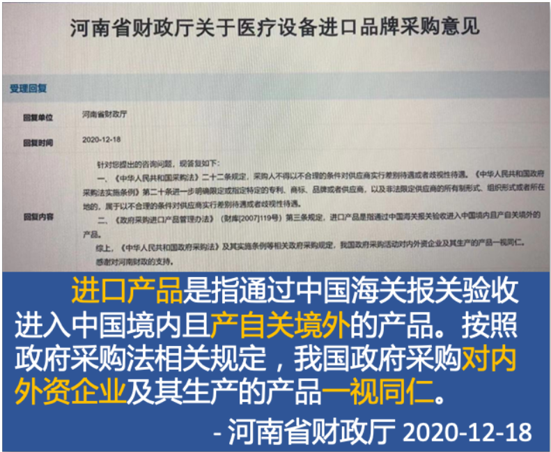 上述可見,各地區(qū)衛(wèi)健委明確規(guī)定了國產(chǎn)設備,即國內(nèi)獨資企業(yè)生產(chǎn)和外資企業(yè)生產(chǎn)的產(chǎn)品或中外合資在我國境內(nèi)投資生產(chǎn)的產(chǎn)品。在采購過程中,應公平對待所有生產(chǎn)國產(chǎn)設備的企業(yè),包括外資企業(yè)。